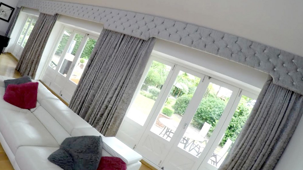 We were commissioned to produce a set of curtain and a pelmet for a set of patio doors. The challenge was to allow access to be able to open and close the ceiling blinds.