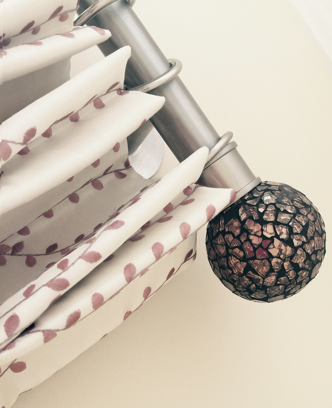 Double pleat embrodiered curtains on titanium poles, rose mosaic finials.