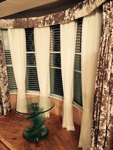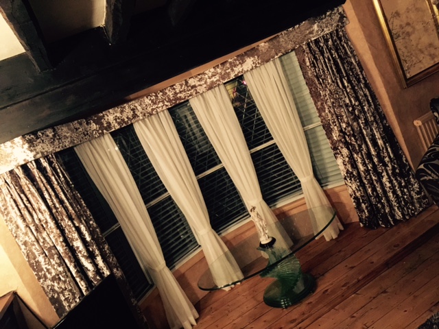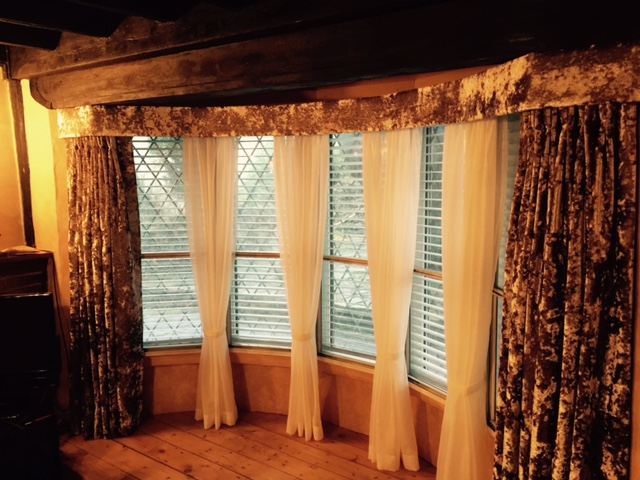 Pinch pleat curtains in crushed velvet – upholstered Mdf pelmets to fit bay windows.