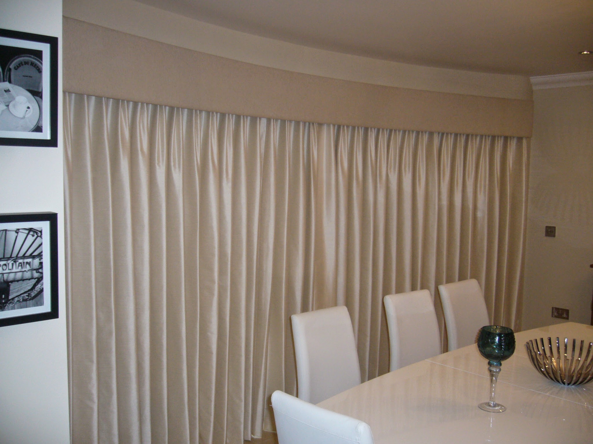 Pinch pleat curtains in faux silk – upholstered Mdf pelmets to fit bay and straight window in Anaconda faux snake skin.