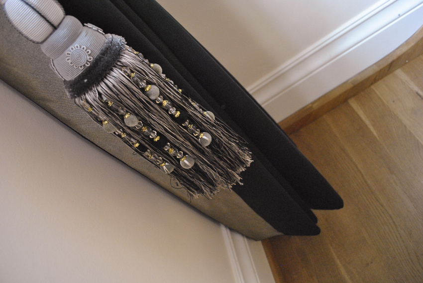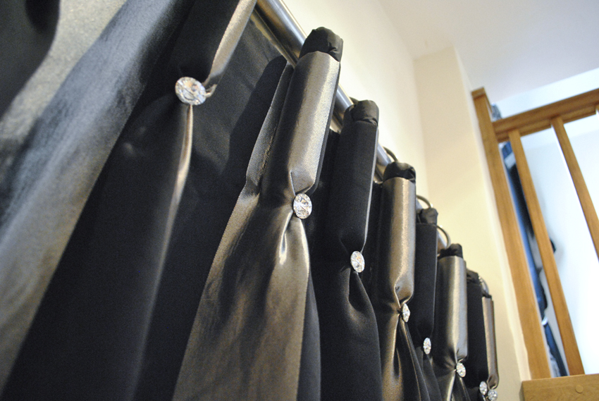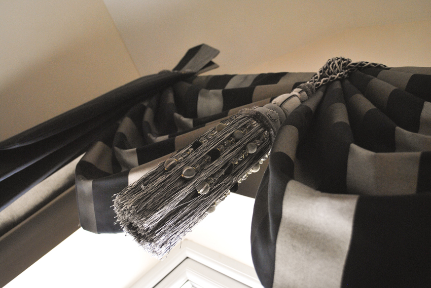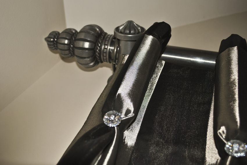 Goblet pleat curtains on pewter poles with Swarovski crystals on pleats, with co-ordinating swags & tails.